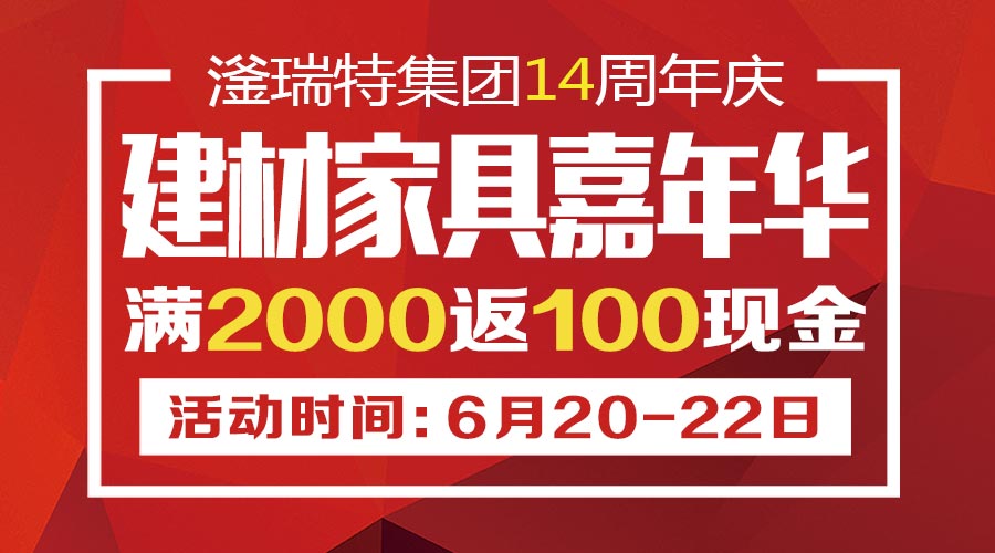 滏瑞特齊家網建材館、家居生活體驗館同賀集團14周年慶,6月20至22日建材家具嘉年華,滿2000元返100元現金,云集大品牌,齊放最低價。限時搶購,瘋狂砍價,整點秒殺。
