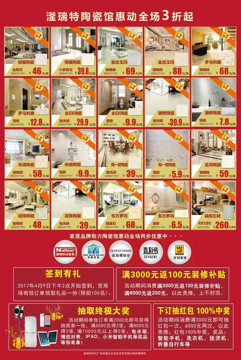 惠裝修就來滏瑞特建材館,全場特惠,廠價直供,2017年3月15日至4月15日活動期間凡單店消費滿800元以上贈精品湯鍋一個,消費滿2000元以上贈電烤箱一臺,消費滿5000元以上贈電飯煲一個,消費滿8000元以上贈微波爐一個,消費滿10000元以上贈紅米智能手機一部。活動期間更有聯單獎,2-3單贈鍋具三件套,4-5單贈電烤箱,6-7單贈電壓力鍋,8單以上贈全自動洗衣機。4月15日九點到九點半集中爆破用戶簽到,預售品兌換,抽取終極大獎。